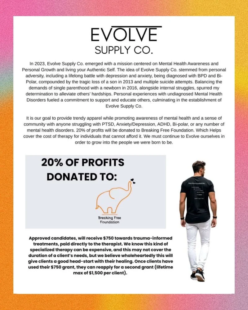 Evolve Supply Co is a mental health awareness brand that sells apparel and accessories. Clothing for a cause! Please check them out and support. 🧡